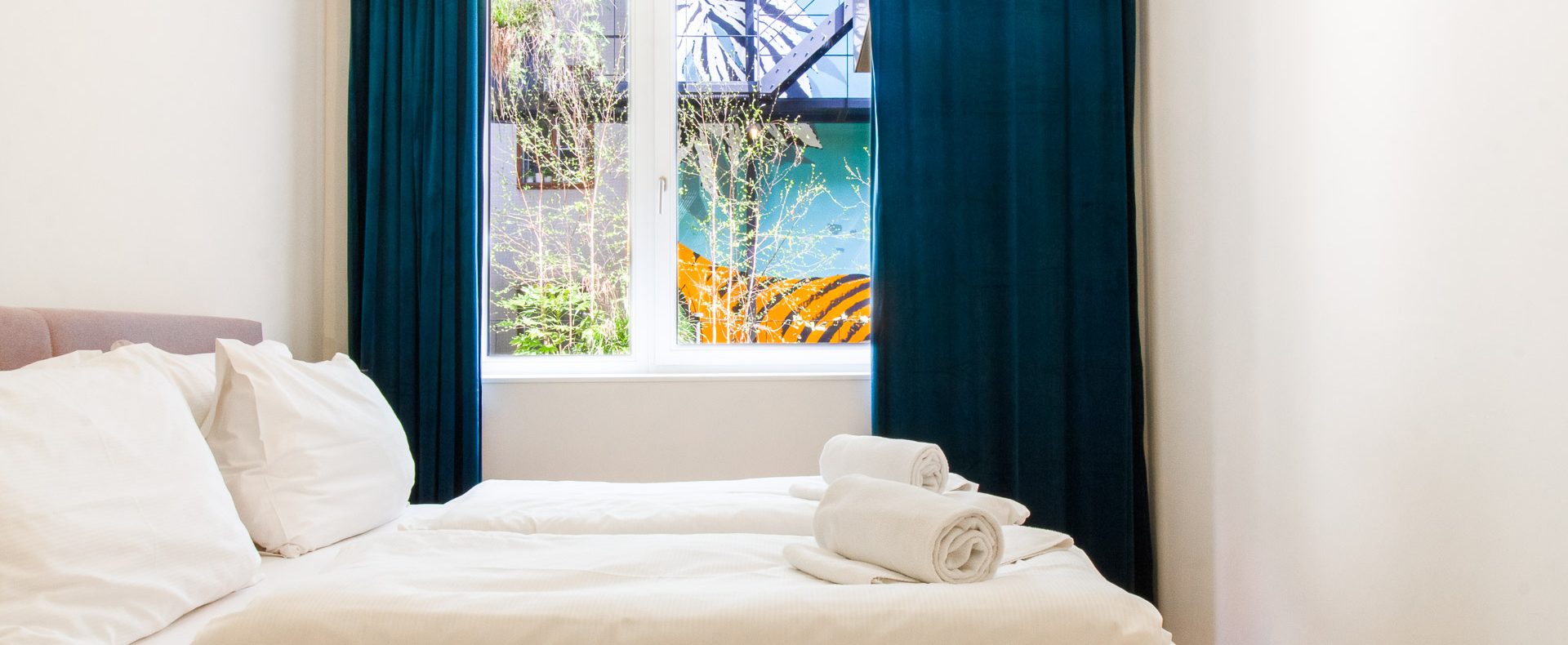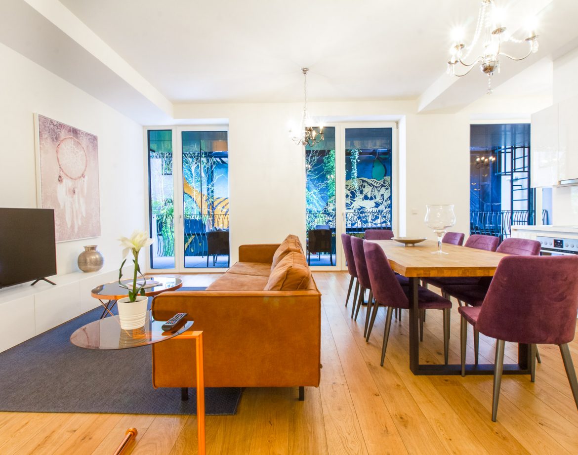 The apartment is 141 square meters and has three bedrooms. Each bedroom is equipped with a top box spring bed. As part of the apartment there is a very spacious living room with a Smart TV. Overall, the apartment has two bathrooms, one in a bedroom and one accessible separately from the hallway. A huge balcony stretches along the entire living room, where you can enjoy your breakfast outside.